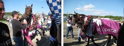 Windsong Stable is very proud that four of our horses were scheduled to compete in races over Elitlopp weekend. The highlight of the weekend was the victory of Bring Me Luck US (Kadabra - Polyester Hanover) in the SEK 300,000 Carlsberg-loppet in a lifetime best 1:57.4f mile rate. Driven by trainer Stefan Persson, Bring Me Luck needed some luck to spring free from her disadvantageous Post 10 in the second tier. However, Persson drove her aggressively to establish position first-over, which she held for most of the race. When the field turned for home, Bring Me Luck simply trotted away easily to win the race. Bring Me Luck US remains undefeated in 2008, and improves her lifetime record to 9 - 7 - 2 - 0 with earnings of SEK 440,000 (almost $75,000 USD). The members of Stall Bring Me KB were jubliant in the Winners Circle after the race, and were interviewed by Swedish television.