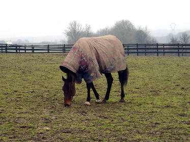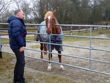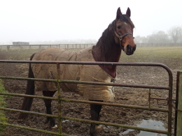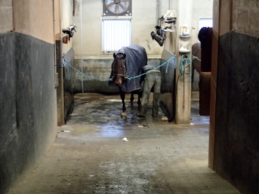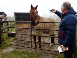 The #1 highlight of my Normandy visit was the opportunity kindly offered by Anne Guarato to visit with Bold Eagle. When we arrived, Bold Eagle was munching hay peacefully in his paddock, blanket on his back against the cold rain, with little to indicate his status as the best trotter in the world. He didn't have much initial interest in us. We reviewed the other fine Guarato stallions before Bold Eagle was brought inside for his bath. Bold Eagle was extremely calm and easy to bathe. He stood patiently while we all took photos with him. He was every bit the gentleman.