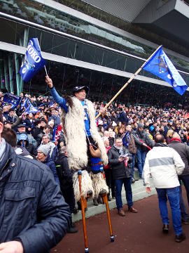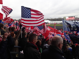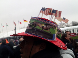Next was the Prix d'Amerique! I don't even know where to begin, except to say that the Prix d'Amerique is surely the premier trotting race in the world. The Prix d'Amerique commemorates the contributions of the US military to the defense of France in World War 1. American and French flags were everywhere. In fact, the American flag was even featured over the French flag in a unique display of honor and friendship. 40,000 spectators packed the Hippodrome, all waving flags. The grandstand held individual cheering sections for fans of the most favorite horses. If fan enthusiasm would determine the winner, Timoko would have won hands down. Bold Eagle of course had his own cheering section. Many of his fans bought souvenir scarves, waved special flags, and wore elaborate homemade hats.