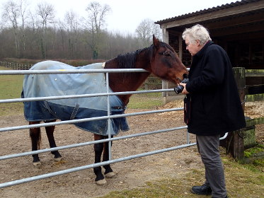 We visited the beautiful showplace Haras de Bouttemont (website here), home of Phillipe and Gitte Allaire, as well as Ready Cash and his sons Bird Parker, Django Riff, Brillantissime, Charly du Noyer, Traders, and Atlas de Joudes. Ready Cash had been sent to a "spa" for swimming and massages to get ready for the breeding season. Instead we reviewed his immaculately groomed sons. All appeared physically compatible with US mares, with less of the robust, massive appearance typical of French stallions. It was difficult to choose a personal favorite, but mine was Charly du Noyer with his flashy coloring, long racing stride, and prominent lines of US blood in his pedigree. Many of my group preferred Django Riff. Any of these stallions would be a great choice for breeders.