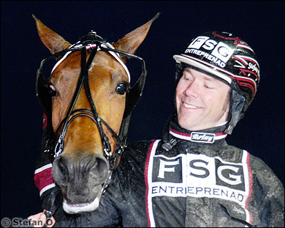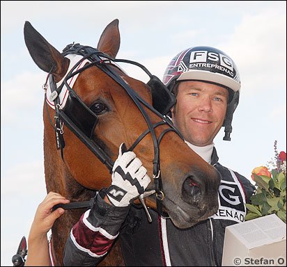 June 10 - The 2008 crop of 3 year old trotting fillies and many better colts in Sweden simply have no answer to the dominant performances of Bring Me Luck US (Kadabra - Polyester Hanover). Today at Jagersro, Bring Me Luck US once again beat a good mixed field of three year old trotters. Bring Me Luck gunned to the lead from Post 7, extended to a 28 second first quarter before slowing the pace. After slowing the pace for the next quarter, Bring Me Luck was challenged twice by the field, and each time turned the challengers away. Bring Me Luck won after a strong stretch drive by over a length in 2:01.1f (mile rate, 1 5/16 miles). Her win extends a 7 race streak, keeping her undefeated in 2008. Bring Me Luck US is now 10 - 8 - 2 - 0 lifetime, with earnings of about $80,000, for trainer/driver Stefan Persson (pictured with Bring Me Luck in the Winner's Circle).