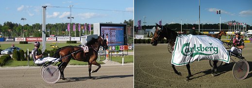 In other Elitlopp weekend racing, Swept To Victory (S Js Caviar - Sweepstake Hanover) overcame a horrible trip to finish a valiant 3rd in the 440,000kr Bronze Division Final. Stuck outside in Post 7, driver Orjan Kihlstrom was completely shut out from any kind of position at the start of the race. Swept To Victory was soon shuffled to the rear of the crowded 12 horse field. Trying to make a move down the backstretch behind Golden Tilly, Swept To Victory was then badly impeded when Golden Tilly made a break, and struck the bike in front of her. Miraculously, Swept To Victory did not break stride, but finally fanned out far wide at the top of the stretch to pass most of the field in a huge rush to finish a well earned third for trainer Roger Wallman. Her 55,000kr prize raised Swept To Victory's lifetime earnings to 1,024,654kr (about $170,000), which will require her to race in the higher Silver Division during the next series. Trainer Roger Wallman has noted that Swept To Victory has gained considerable confidence and calm this year, which allows her to race more effectively, even with adverse circumstances.