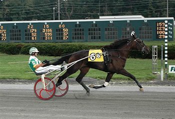 July 23 - Chandelle (Majestic Son - Aeronautess) swooped over the competition to win her first Stakes race, a $25,200 ONTSS-GR for two year old trotting fillies at Kawartha Downs tonight. Starting from Post 5, Chandelle quickly established a lead for driver Warren Hie. Chandelle remained in command until the top of the stretch where she was briefly challenged, but then pulled away for a comfortable one length victory in 2:03.3f. Owned by Roger Hie, Hielite Acres, and Fabulous Farms of NJ, Chandelle will compete in more ONTSS-GR events in the near future.
